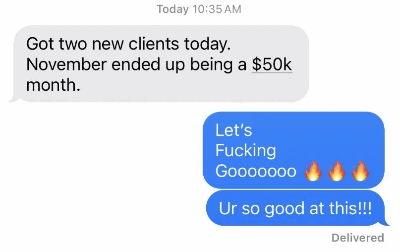 “My life just keeps getting more and more joyful. I can’t even fathom what the fuck is going on because I’m not working harder…I just seem to be making more money…I just got a new client, I’m getting referrals…it’s totally in my field.”